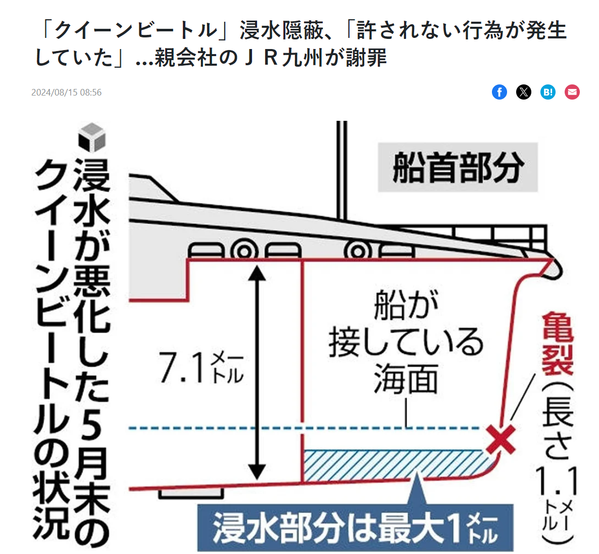 지난 2024년 2월 선체 균열로 누수가 발생했음에도 이를 은폐하고 3개월간 운항하다가 일본 국토교통성에 의해 적발되어 운항이 중단된 것이죠.